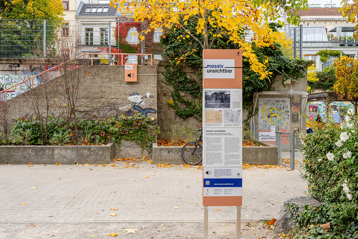 baulich wurde den bestehenden schichten eine neue hinzugefügt, die mit interventionen an verschiedenen stellen aufmerksamkeit und interesse wecken soll: eine frei stehende stele informiert auf deutsch und englisch über errichtung und funktion des bunkers, berichtet von diversen überlegungen der nutzung nach kriegsende, sowie über das projekt massiv unsichtbar selbst und bietet über einen qr-code die verbindung zur projekt-website an.