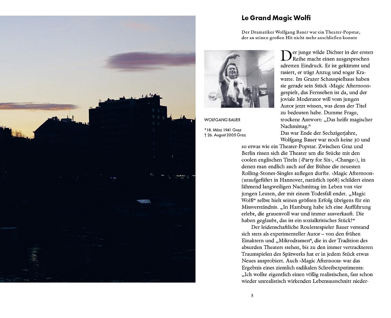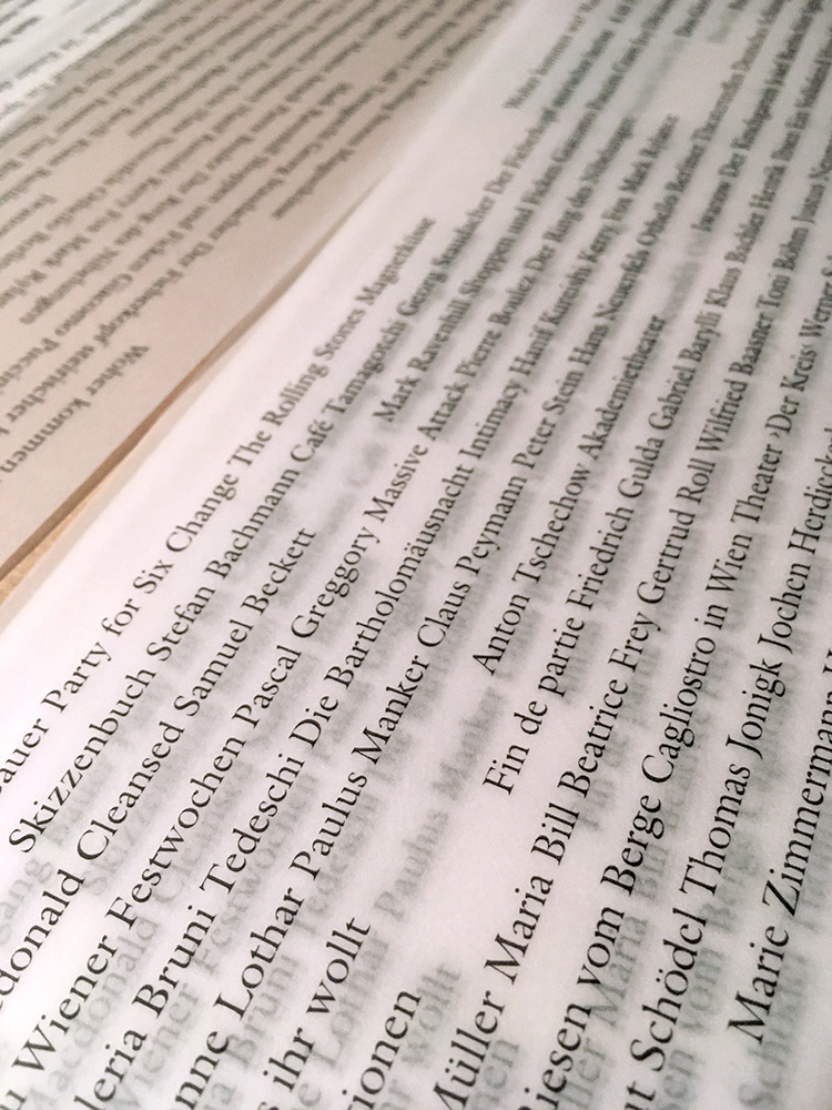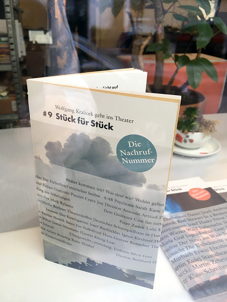 Stücke: Die Welt im Rücken (Akademietheater), Wunschloses Unglück (Kasino, Burgtheater), sowie ein Portrait vom Schauspieler Haymon Maria Buttinger und einem Essay über das Wiener Theaterpublikum