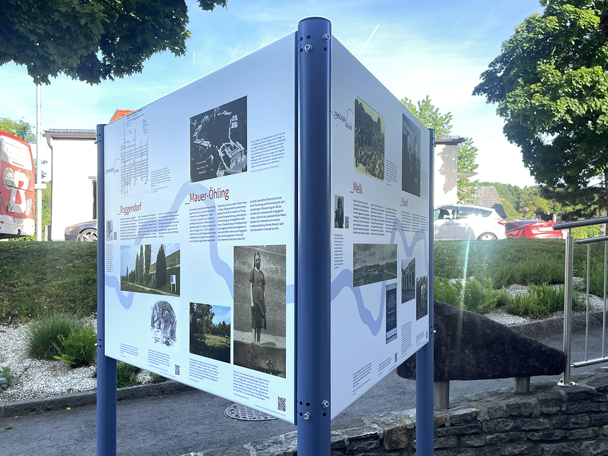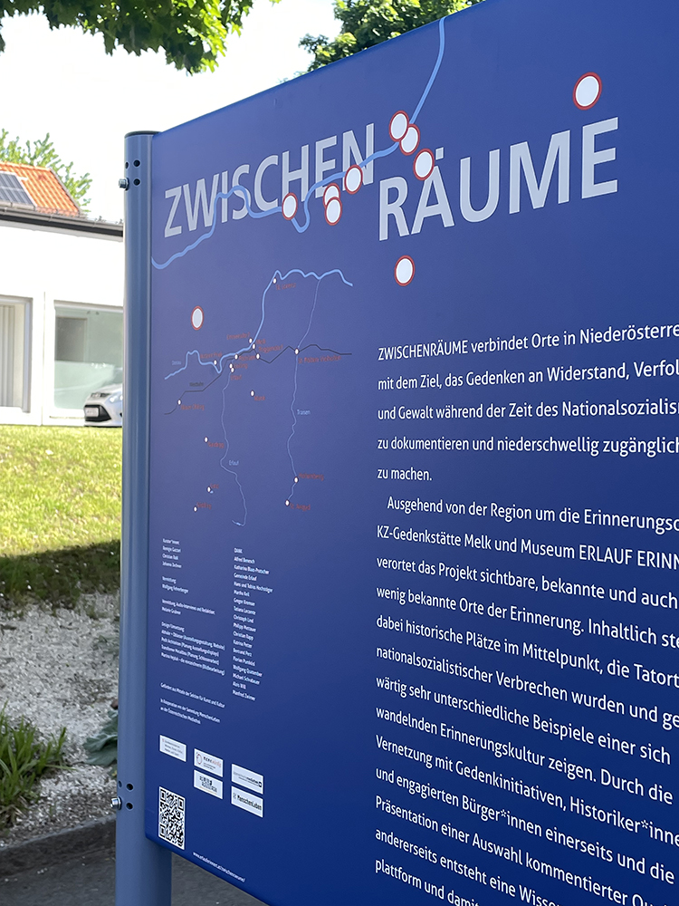 bekannte erinnerungsorte wie die kz-gedenkstätte melk und das museum erlauf erinnert, sowie auch weniger bekannte orte der erinnerung stehen im mittelpunkt der historischen aufarbeitung. es gibt verweise auf die website, die per qr-code mobil aufgerufen werden kann, um etwa die video-interviews von zeitzeugen abzurufen.