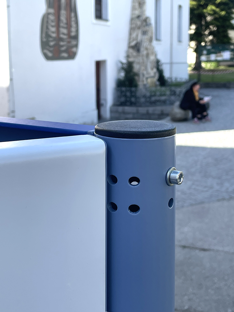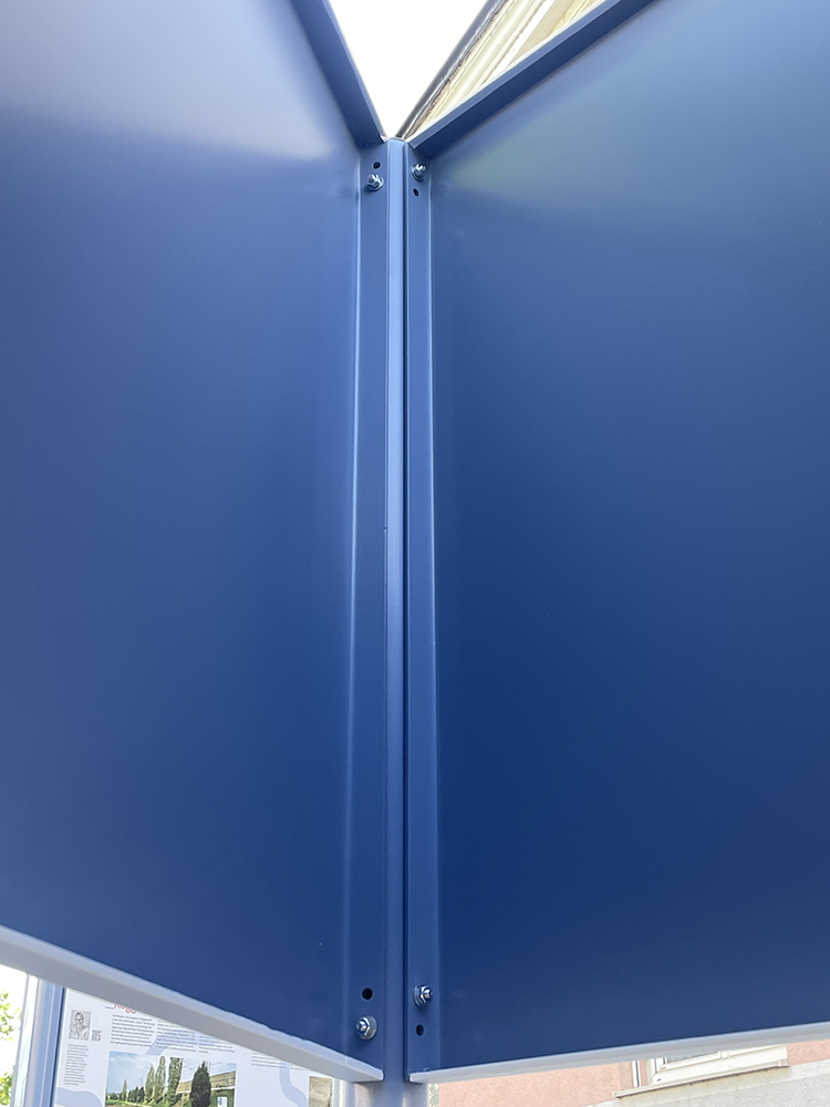 die ausstellung kann im gemeindezentrum, am dorfplatz oder in einer wiese mit ein paar handgriffen aufgestellt werden. verschiedene formationen der tafeln stehen zur verfügung: dreieck, quadrat, sechseck, eine frei stehende tafel und eine zick-zack-linie. durch die höhenverstellbarkeit der steher kann auch ein unebenes gelände ausgeglichen werden. die einstiegstafel erkleutert das projekt, alle weiteren tafeln sind jeweils zwei gemeinden gewidmet. das system bleibt so für künftige ausbaustufen erweiterbar.