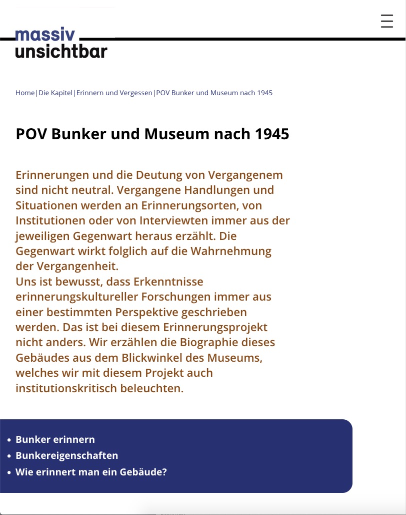 baulich wurde den bestehenden schichten eine neue hinzugefügt, die mit interventionen an verschiedenen stellen aufmerksamkeit und interesse wecken soll: eine frei stehende stele informiert auf deutsch und englisch über errichtung und funktion des bunkers, berichtet von diversen überlegungen der nutzung nach kriegsende, sowie über das projekt massiv unsichtbar selbst und bietet über einen qr-code die verbindung zur projekt-website an.