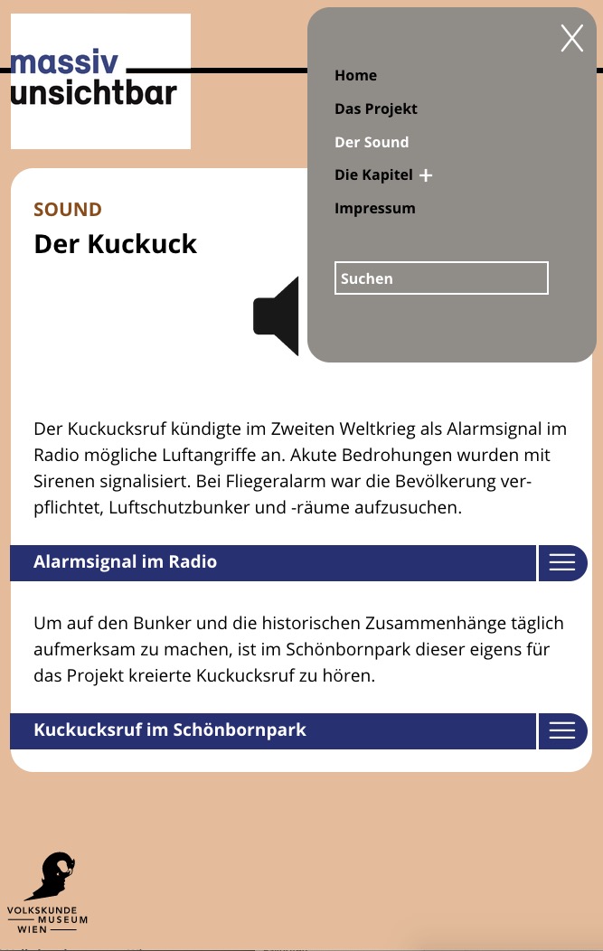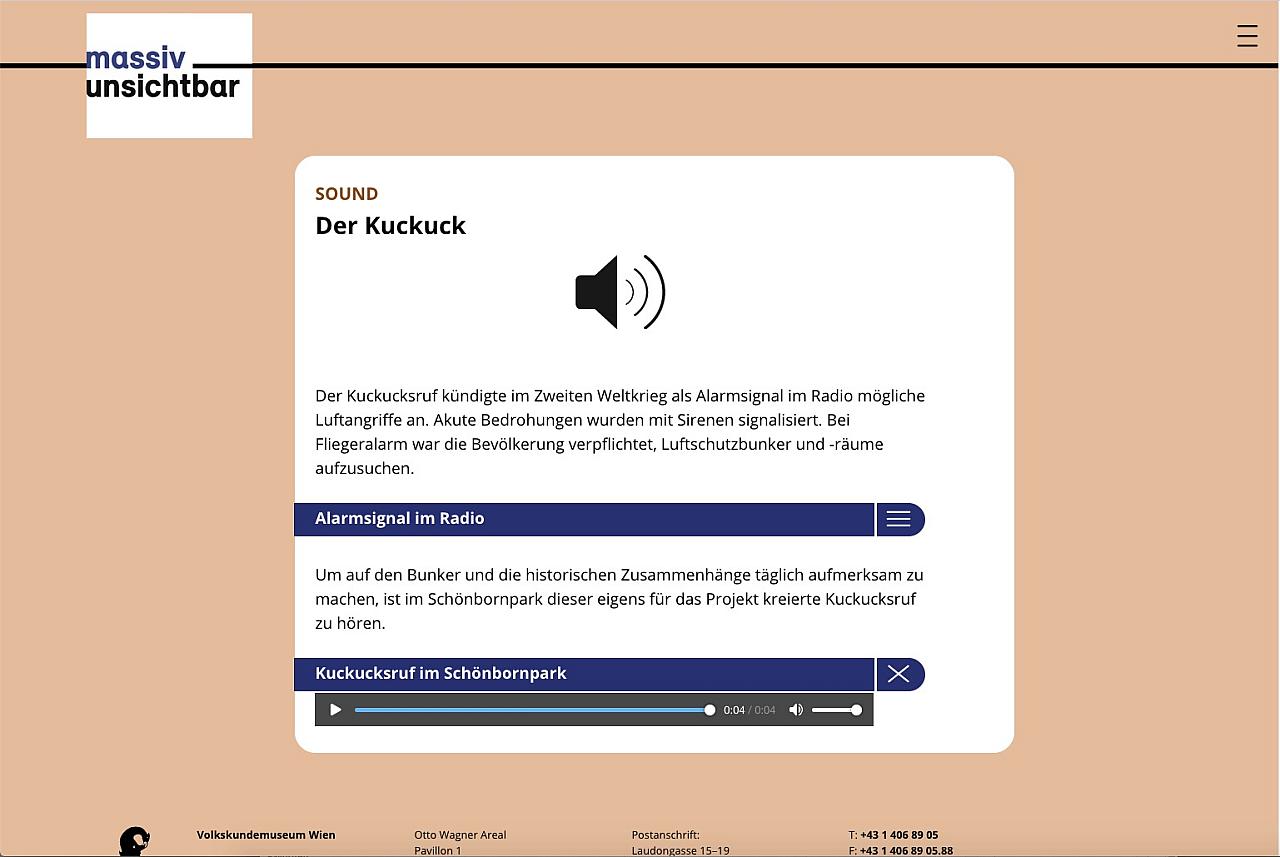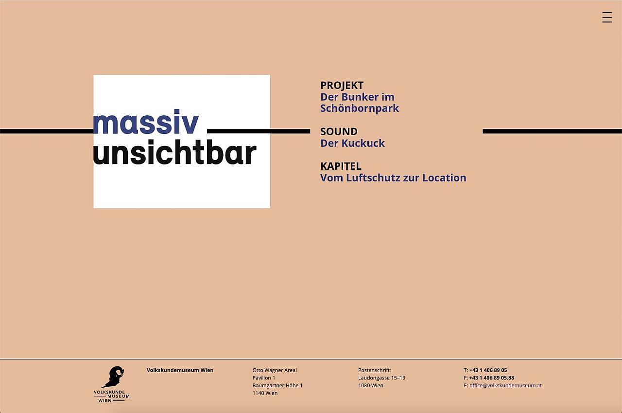 baulich wurde den bestehenden schichten eine neue hinzugefügt, die mit interventionen an verschiedenen stellen aufmerksamkeit und interesse wecken soll: eine frei stehende stele informiert auf deutsch und englisch über errichtung und funktion des bunkers, berichtet von diversen überlegungen der nutzung nach kriegsende, sowie über das projekt massiv unsichtbar selbst und bietet über einen qr-code die verbindung zur projekt-website an.