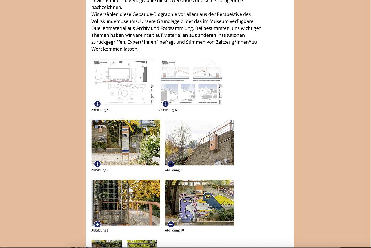 das volkskundemuseum stellt im park gratis w-lan zur verfügung, interessierte besucher:innen können so über die bei allen baulichen interventionen angegebenen qr-codes schnell auf die website mit ihrem umfangreichen material zugreifen.